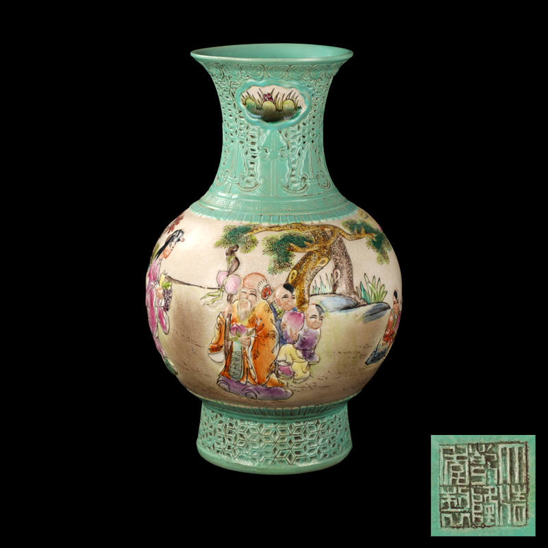 大清乾隆年制款松石绿釉镂空粉彩童子拜寿赏瓶