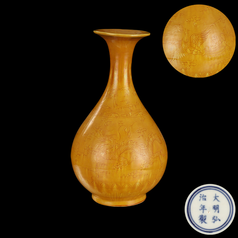 大明弘治年制款焦黄釉暗刻龙凤纹玉壶春瓶
