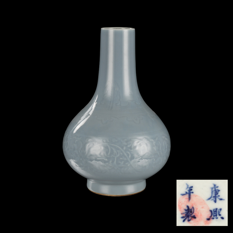 康熙年制款天青釉暗刻菊瓣纹胆瓶
