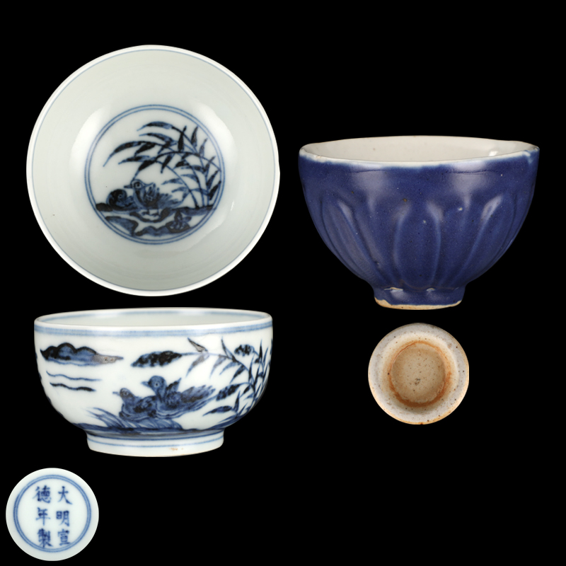 大明宣德年制款青花鸳鸯戏水小碗、明代霁蓝釉暗刻菊瓣纹小碗