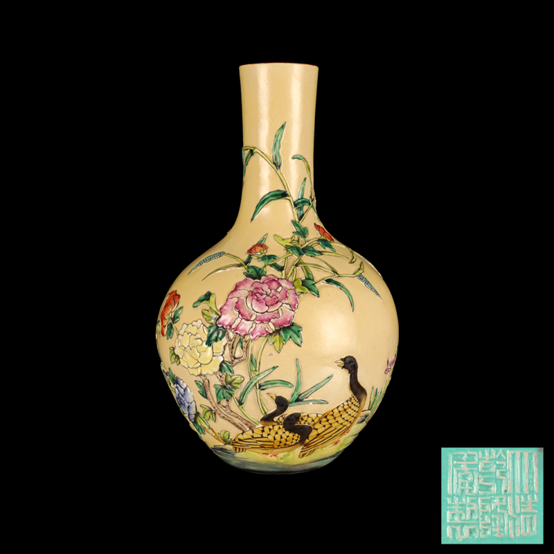 大清乾隆年制黄釉堆塑粉彩天球瓶