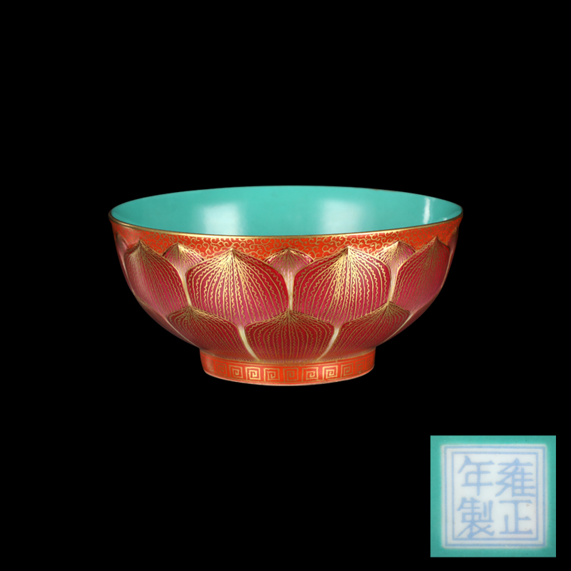 雍正年制款珊瑚红加金彩莲瓣纹碗