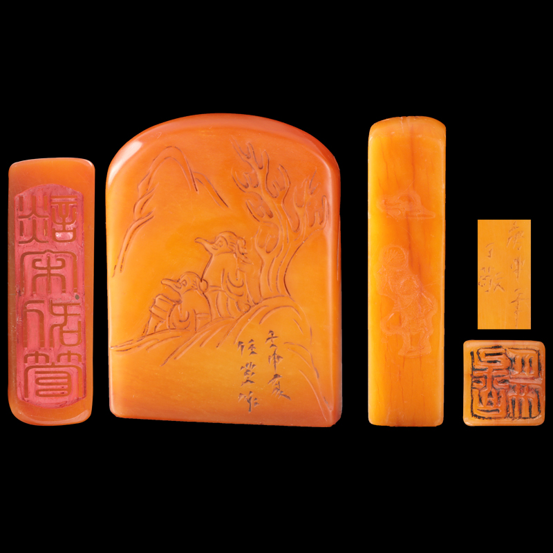 田黄石套章。自古道“一两田黄十两金” 此品为两件套章用上好田黄石雕琢而成,主章器面以薄意技法构图,石质纯净无暇,肌理温润通灵如凝脂,画风布局依石就形,静穆的古树参天入云,人物刻画谈笑风生,意境深遂。印文篆刻丁敬,清代著名书画家,篆刻家,技法风格独特,其印谱被海内奉为圭臬,日本名士也以高价购买。此品材质精良,刻画精细,堪称是珠联壁合之罕见佳作! |