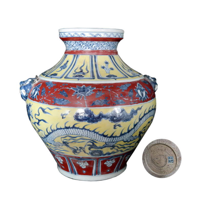 黄釉青花龙纹辅首尊