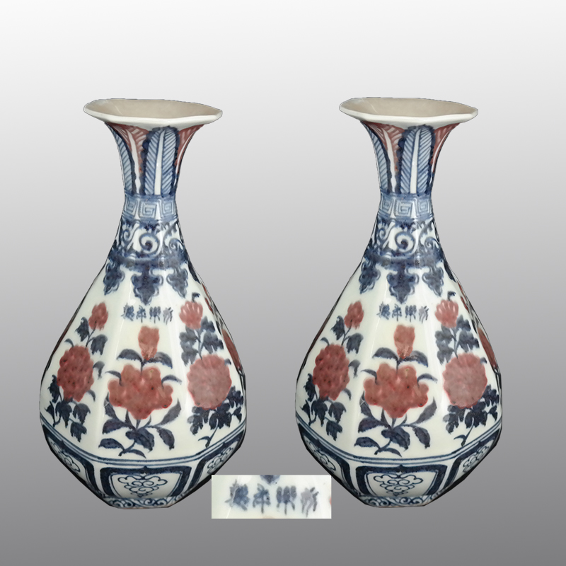 青花釉里红花卉六方玉壶春瓶