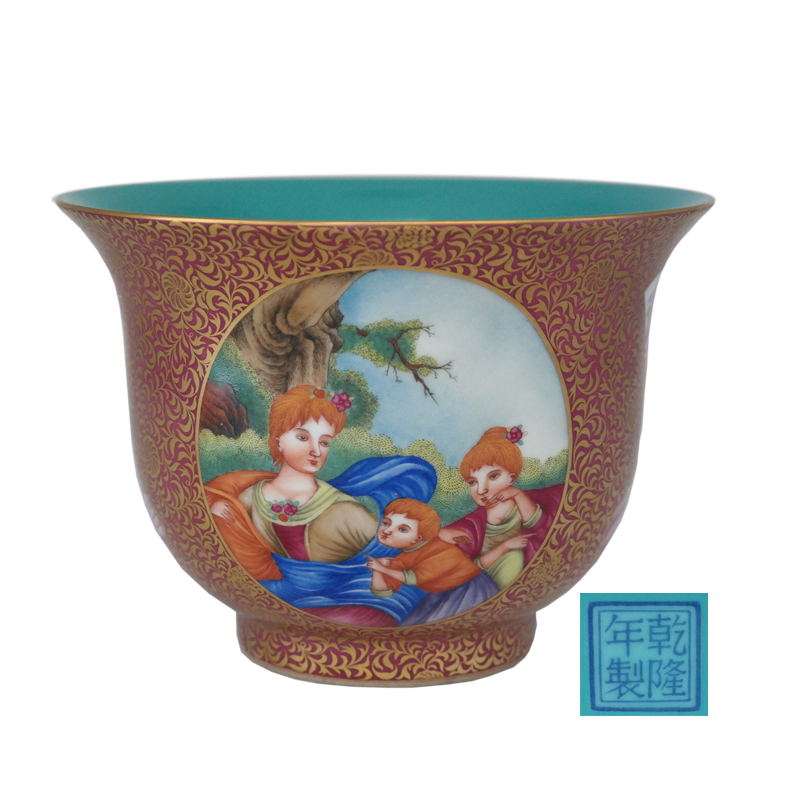 胭脂红釉描金开光西洋人物珐琅彩碗