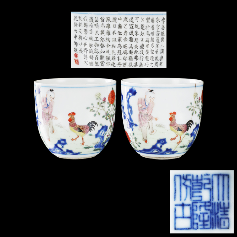 青花粉彩诗文鸡缸杯(一对)