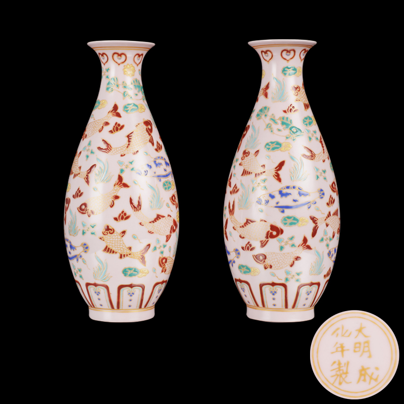 斗彩矾红描金年年有鱼瓶(一对)