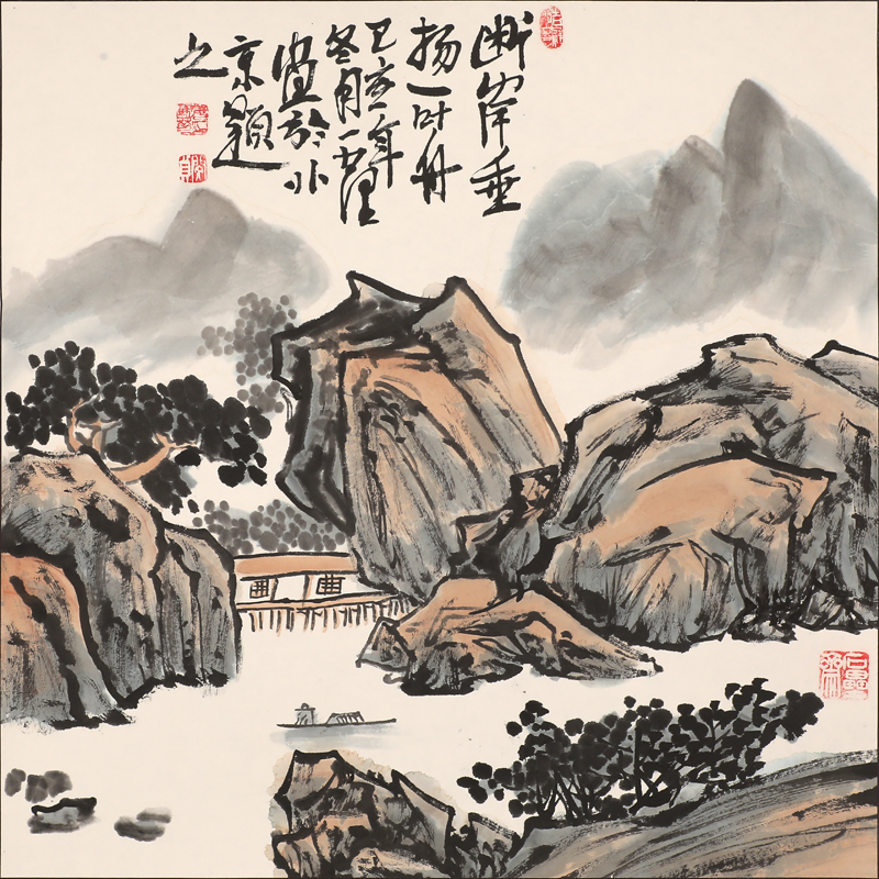 此画作具有独特的个人风格,拙朴中见意境,山水融合和谐惬意,构图豪迈超逸,笔墨浓厚布局结构或有夸张或有变形,彰显其扎实的笔墨功底和别具风格的艺境情趣,为收藏佳作及价值。