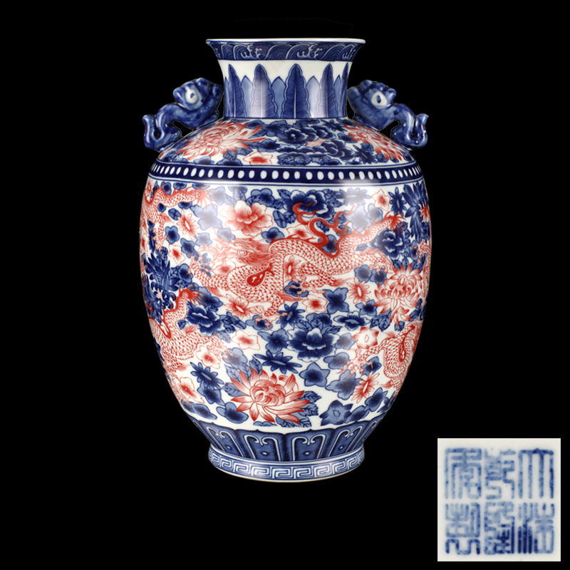 大清乾隆年制款青花釉里红兽耳尊
