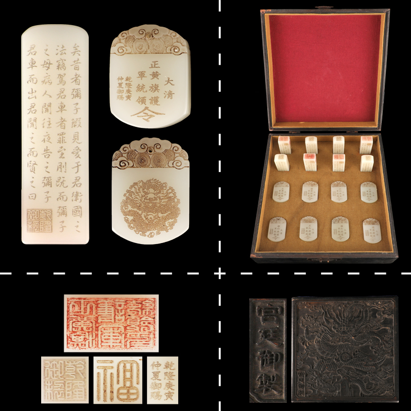大清乾隆御赐和田玉八旗统领印章令牌,使用上乘的和田白玉制作而成,玉质洁白如脂,温润细腻,包浆自然浑厚。由清宫造办处玉雕大师使用独特技法砣、刻、点、錾、冲、琢磨等多种工艺雕刻后使用敷染上色法沉淀出清晰的纹饰。令牌肩部刻如意祥云纹,正面刻龙纹,背面刻大清“黄、白、蓝、红,八旗正副护军统领牌”乾隆庚寅仲夏御赐款。印章上方刻“福”字,下方刻“黄、白、蓝、红正副护军统领印”篆体。印章和令牌文字组成相互对应,纹饰流畅、字迹清晰,气势磅礴,工艺精美绝伦,纯手工打磨,返璞归真,自然老旧痕迹明显,堪称传世佳作,充分彰显出乾隆盛世皇家宫廷制玉最高水平。此套八旗印章令牌共计十六枚,总重量为1425克。根据近十年国内外拍卖市场,乾隆宫廷造办处玉器成交记录上升走势,此宝物具备真、精、稀等文物价值,研究价值,历史文化传承价值。具有极高的未来升值空间,实属罕见的稀世珍宝,值得收藏。 |