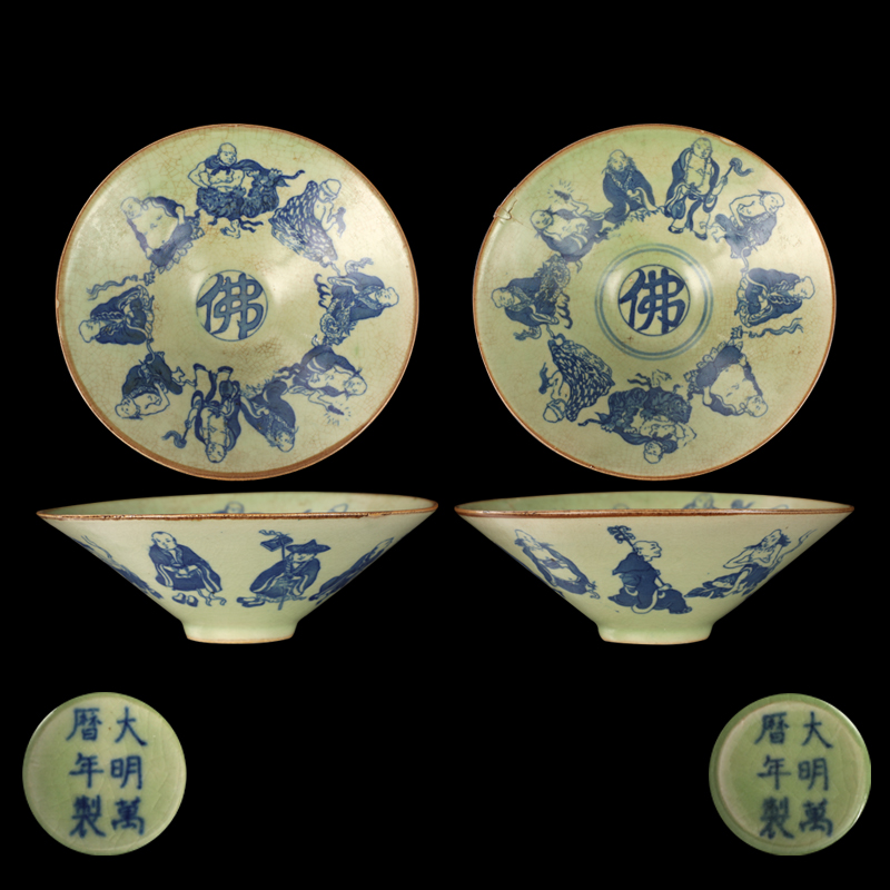 大明万历年制青花十八罗汉纹佛字碗一对