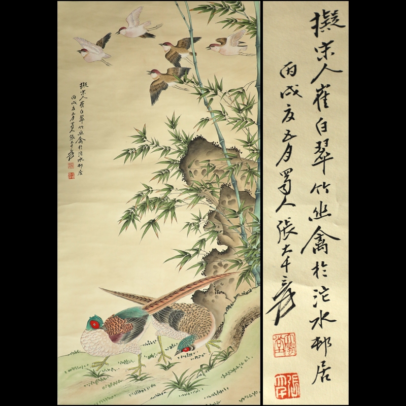 张大千的花鸟画起初走写意路线,自二十世纪三十年代中期开始,渐学宋人的工笔院体,使得张大千既在笔墨和设色上得古人精华,又以独特的审视角度赋予物象新的生命。本幅花鸟构思巧妙,细致入微,雀鸟成群,穿翠竹而过,下方锦鸡邻水而居,构图疏密有致,意境清幽,兼具优雅的书卷气和唯美的情趣,不失为张大千花鸟作品的精品。