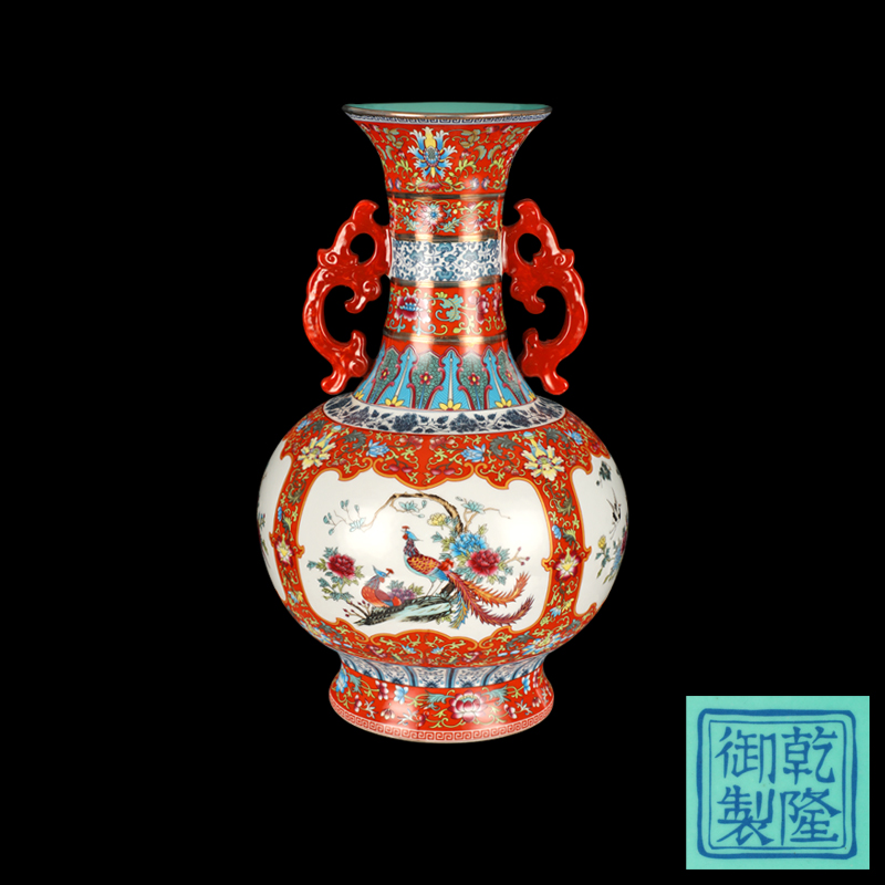 清 乾隆年制款珐琅彩开光龙耳赏瓶