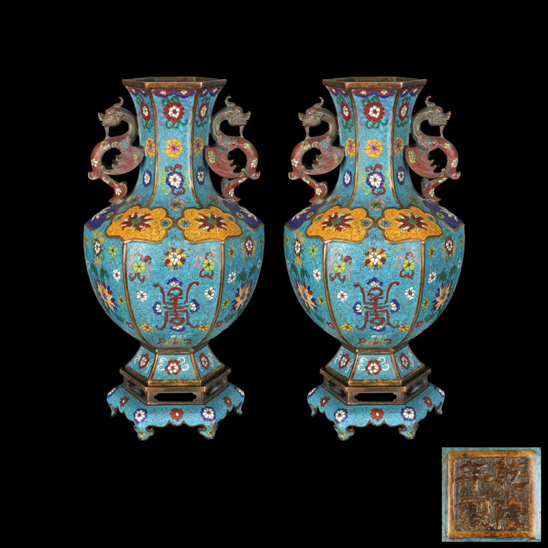 乾隆年制款铜胎珐琅寿字飞龙耳六方尊一对