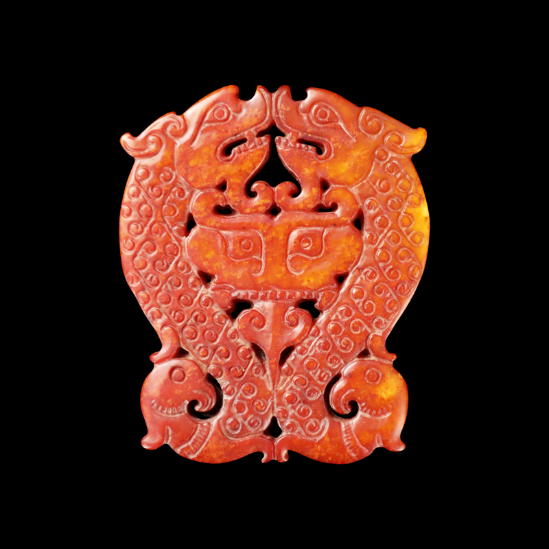 汉代黄玉双龙佩,此玉佩使用上等和田黄玉雕刻而成,玉质温润细腻,包浆厚重自然,整体朱砂沁色甘红如栗,深入玉髓,采用汉代典型游丝毛雕,平雕,圆雕,透雕,剔雕,双面雕等多种手法雕刻而成,雕工精湛细腻,线条劲挺,双龙相接,龙佩形体雕塑质朴谦恭而又带盈盈神韵,望之古雅神奇,双螭龙盘侍卫饕餮纹,遇有辟邪吉祥之寓意。整体成椭圆形,造型精美霸气,工匠创造性把握玉料的自然色泽和纹理特点,巧妙将双龙首尾相应,此玉佩属于地位佩戴之物,显示出皇权之象征,为汉代非常罕见的玉佩珍品。具有极高的博物馆及私人收藏价值! |