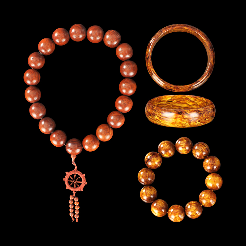 黄花梨十八罗汉佛珠、金丝楠木手串、手镯一组