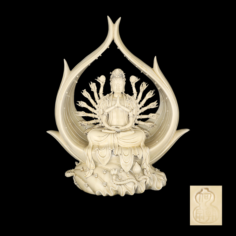 此莲花千手观音以徳化窑独有的象牙白质塑造而成,通体施象牙白釉,釉面纯净而滋润,上下两层,观音头戴天冠,面目慈祥,面相丰颐饱满,璎珞悬胸身披法衣。目光俯视,手指芊芊,手持法器,双腿结叠,物我皆空地跌坐在仰莲座上,整体造型塑造完美,既人性化,又神圣化,工艺繁复,造型精美,背刻印何朝宗葫芦印款,更显庄严稳重高贵典雅,属于明代德化窑何朝宗精品,具有及大的收藏价值与研究价值。 |