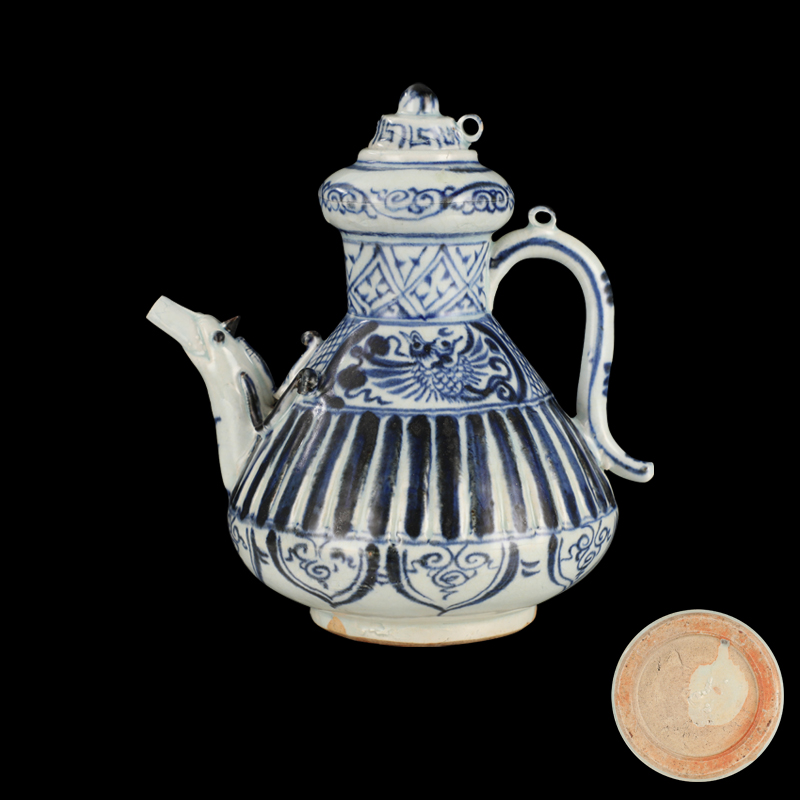 元青花凤纹执壶,器形小巧,造型别具一格,尽显豪放之气,凤纹与苏麻离青浓烈酣畅的发色相得益彰,代表了当时极高的艺术成就!
