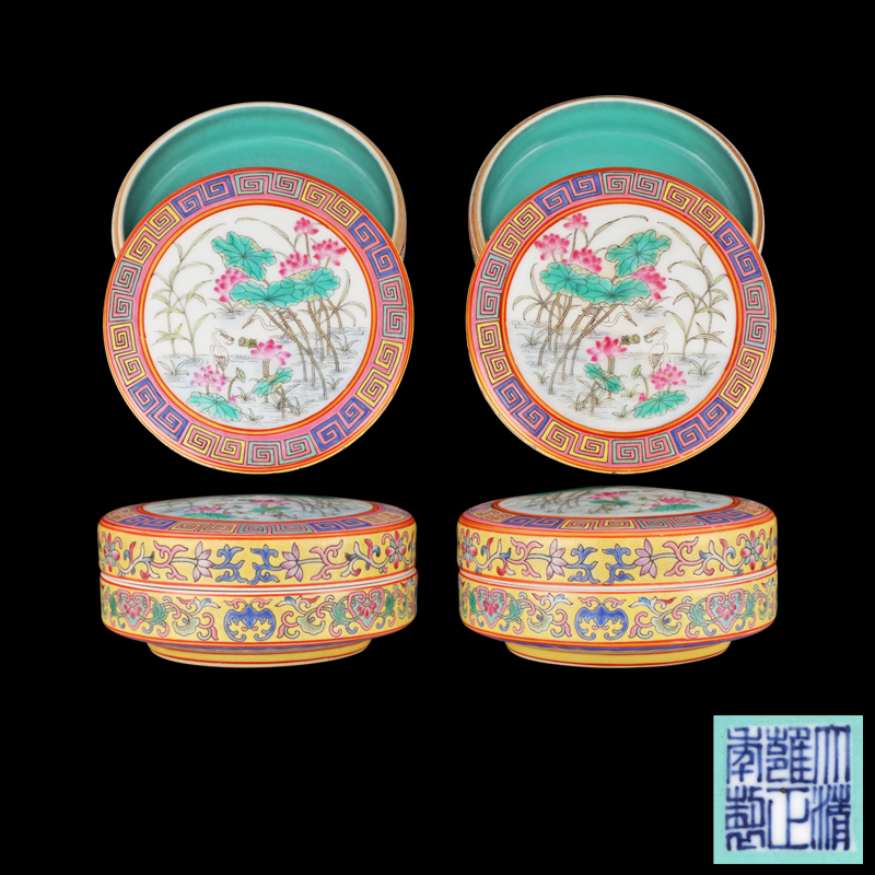 大清雍正年制款珐琅彩一鹭莲升纹粉盒一对