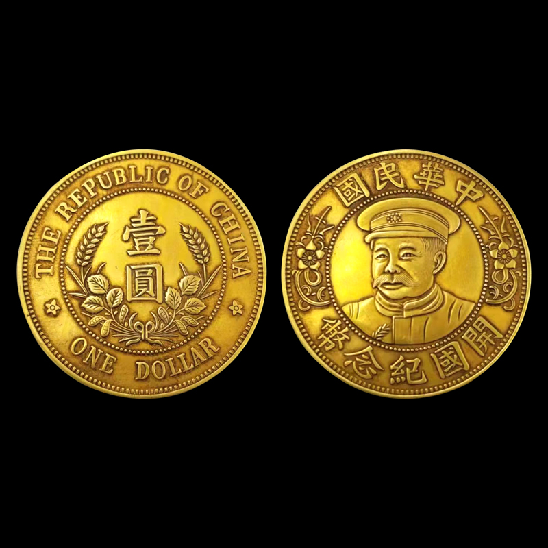 此件黎元洪版中华民国开国纪念币,为金质打造,正面铸黎元洪戴军帽像,神态自然,威武大气。珠圈外上环刻有“中华民国”四字,下环刻有“开国纪念币”五字,左右两侧分列梅花图案;背面图案中央是竖刻“壹圆”二字,珠圈外上环刻英文“THE REPUBLIC OF CHINA”(中华民国),下环刻英文“ONEDOLLAR”( 壹元 )。铸造精细,品相完美,包浆自然,黎元洪像开国纪念金币已十分少见,且价值不菲,由于存世量很少,具有很高的艺术与收藏价值! |