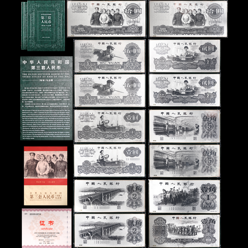 第三套人民币由中国人民银行于1962年4月20日开始发行,至2000年7月1日停 止流通。历经38年,共有7种面额,是在我国全面建立社会主义制度,开始社会主 义经济建设的新形势下设计、印制的,是完全依靠我们自己的力量完成的。设计、 印制过程中充分体现了独立自主、自力更生的时代精神。整套票版是以党的建设社 会主义总路线为题材,集中反映了当时我国以农业为基础,以工业为主导的方针。 生动呈现了我国工农业发展的阶段历程以及社会主义建设的新成就,主题思想鲜 明.设计风格新颖。 在我国现已发行的人民币中.第三套人民币流通时间最长,它是中国社会、经 济、文化发展的见证,是传承民族精神的瑰宝,具有弥足珍贵的纪念与收藏价值。 |