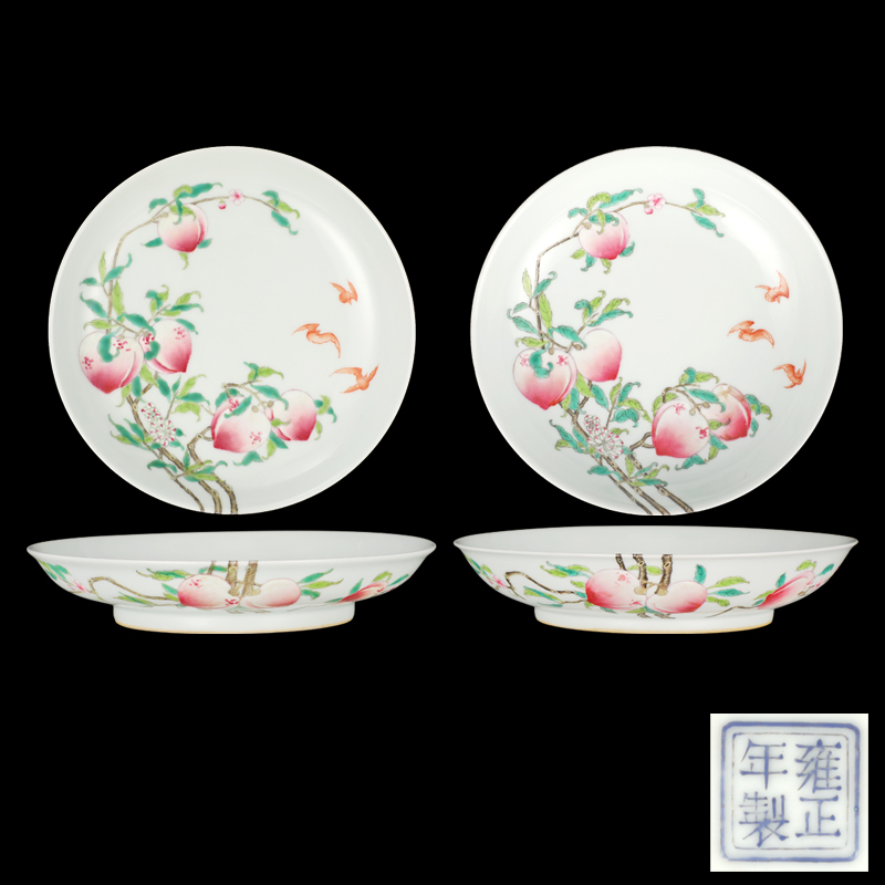 雍正年制款粉彩五福捧寿盘一对