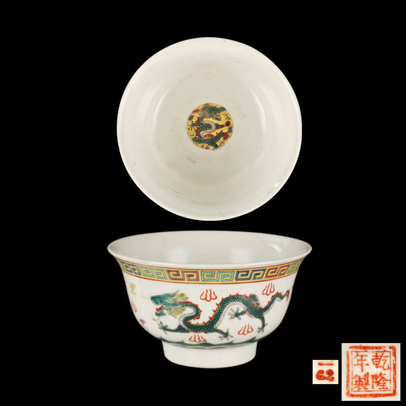 此碗精致小巧,碗撇口,深腹,圈足,碗心正中绘龙纹,龙身做盘旋腾飞之势,姿态威武,外壁口沿下一周绘有红黄绿蓝四色回纹,用料特殊,料彩也称“珐琅彩”精研融入了红宝石蓝宝石等宝石料,为色彩增添颇多韵味,腹部绘二龙戏珠,二龙青龙红脊红绿相间,龙首相对,五爪飞扬,动感十足,在古代,龙被视为四灵之首,所以人们认为人间的九五之尊也是天上的真龙下凡所化,故而帝王皆被称为真龙天子,因此龙的寓意也就和权势地位相关,龙首之间出红色火珠纹,龙牙肆意颗颗饱满,胫部绘绿色海水纹,底部足内书“乾隆年制”四字楷书印章款,碗底足内圈有书“62”字样,为庆贺乾隆帝62岁寿辰特殊定制器物,青龙属木有春回大地,生气勃勃,蓄势待发的寓意,作为乾隆帝寿辰献礼尤为适合,碗虽小巧但绘工精细栩栩如生,选材考究发色沉稳艳丽,宝石料彩加珐琅彩的工艺极其罕见,为不可多得的传世孤品,具有极高的历史价值,研究价值,艺术价值,收藏价值与升值空间不可限量。 |