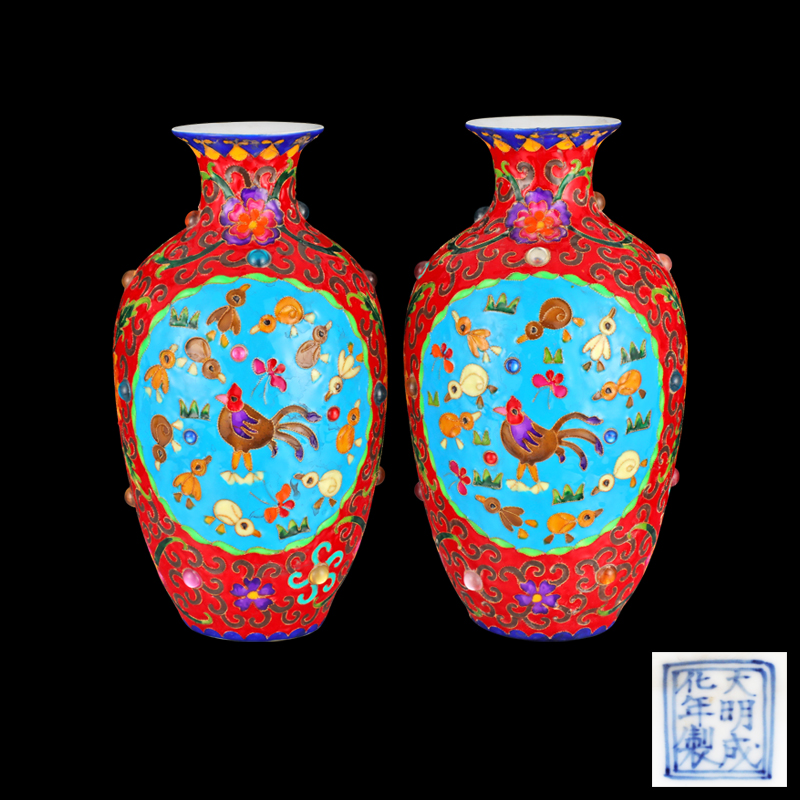 此成化瓷胎掐丝珐琅赏瓶,造型优美,似婷婷玉立的姑娘,修长的身姿,优美多彩的外衣,给人以感观上的享受!那轻盈的身躯,坚致的胎体,用强光从口向腹内照射,瓶外壁纹饰更显得艳丽多彩,惹人喜爱。此瓶成对,保存完好,实属难得。瓶身镶嵌宝石,收藏价值更高!