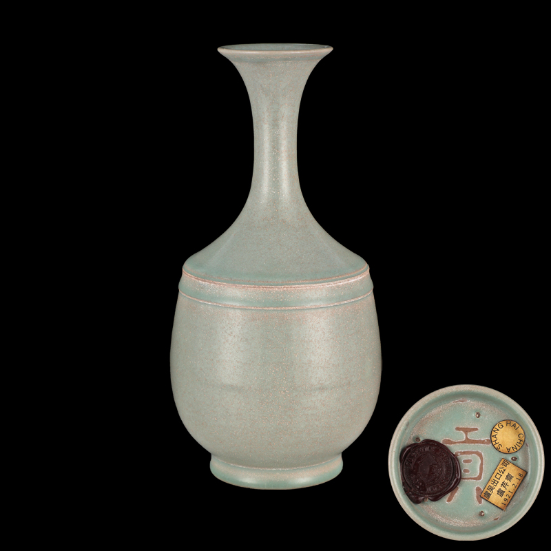 此件汝窑弦纹赏瓶器形规整,釉色莹润光洁,浓淡对比自然,线条简洁雅致,凸起的弦纹改变了造型的单调感,增强了器物的装饰性。釉色给人以凝厚深沉的玉质美感,底部有(卢芹斋)贡字款,是宋代汝窑瓷器的代表作品。