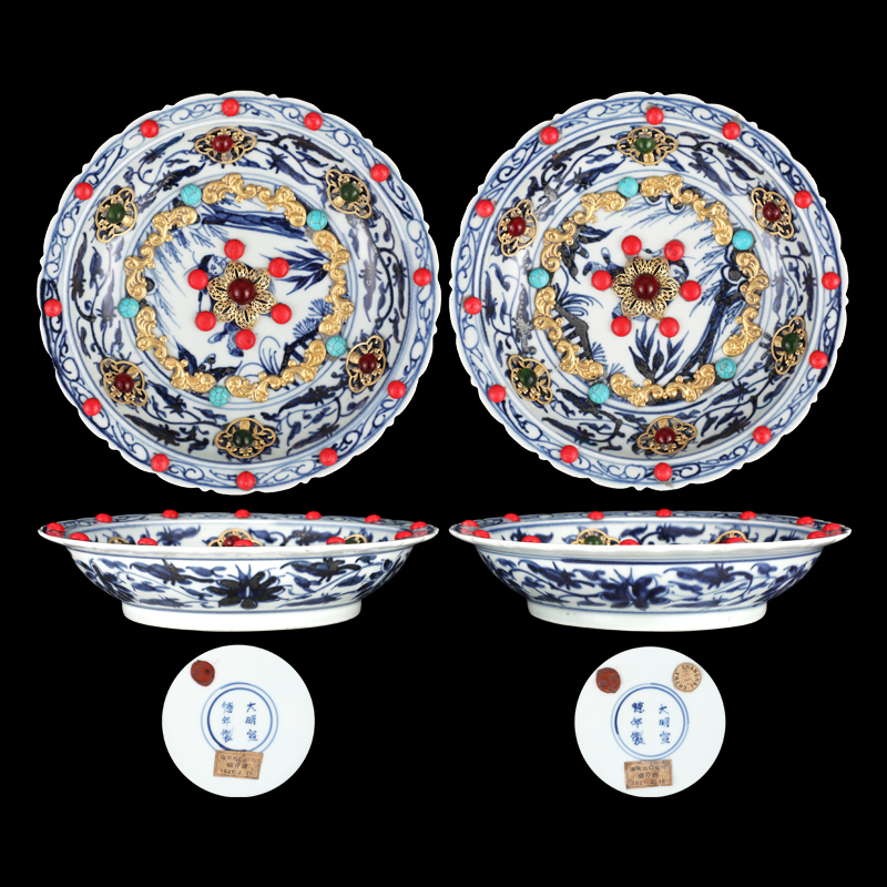 敞口,浅弧腹,圈足。盘通体白地青花装饰,盘心及内外壁均饰青花缠枝莲纹,外底青花书“大明宣德年制“款。造型规整,胎质洁白,釉质莹润,青料发色艳丽,青花绘莲纹,寓意“清廉”。该盘工艺精湛,绘画精细,款识工整,是明代宣德的典型器物。器物上镶嵌宝石,收藏价值非常高!