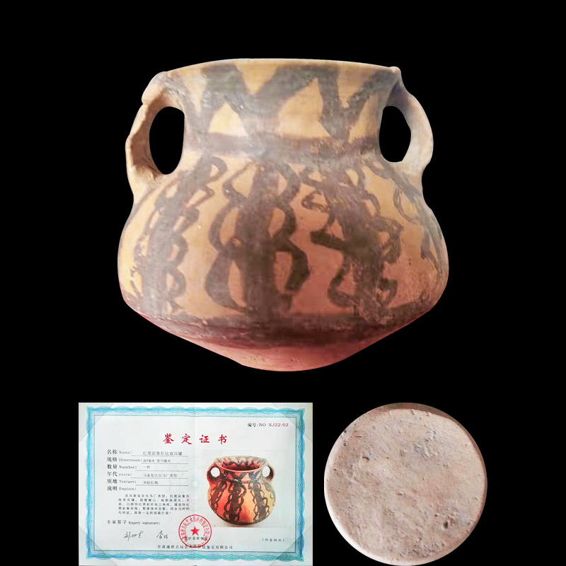 马家窑文化是仰韶文化向西发展的一种类型,是齐家文化的源头之一。出现于距今五千七百多年的新石器时间晚期,历经了三千多年的发展。红黑彩象形纹双耳罐,鼓腹撇口,肩部双耳,平底,口部饰红黑彩折线三角纹,腹部象形纹,整器保存完整,不可多得,颇具收藏价值。