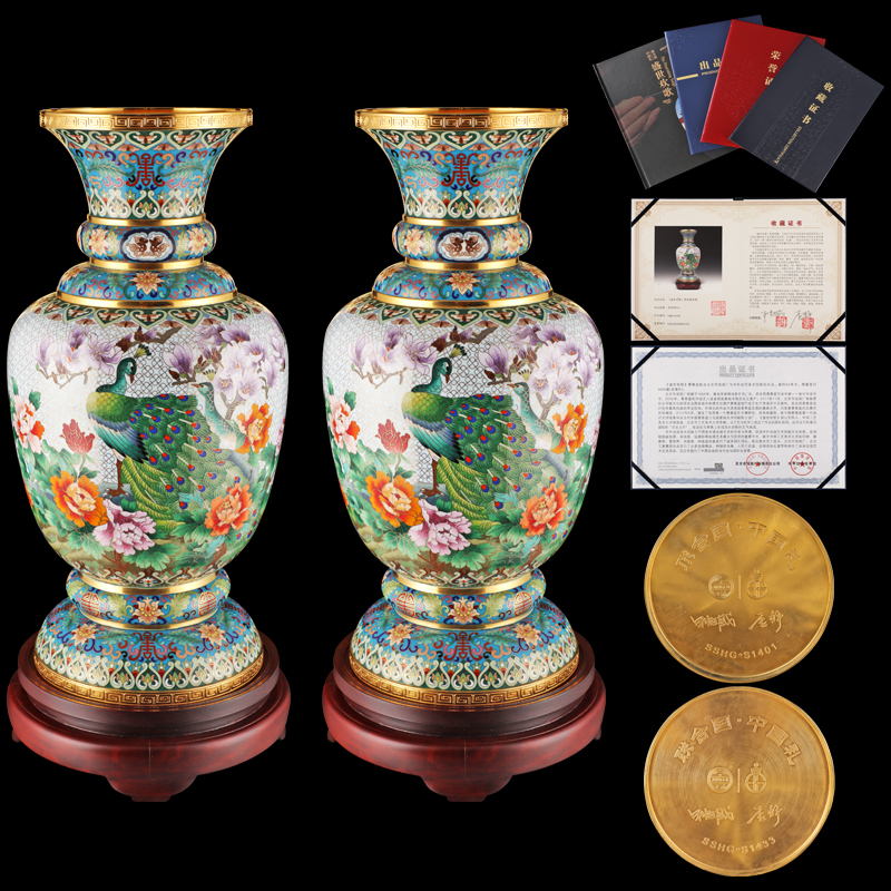 钟连盛 李静 《盛世欢歌》景泰蓝瓶 一对