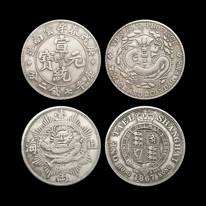 庚戌春季云南造宣统元宝七钱二分:该币正面点圈内为汉文和满文“宣统元宝”字样,外围镌“庚戌春季云南造”,两旁饰花饰,下镌“库平七钱二分”六字。背面蟠龙居中,外围为英文,两旁列花饰。 上海壹两:1867年(同治六年),香港造币厂设计并试铸,正面镌蟠龙,外圈有芒射纹,并镌“壹两上海”四字。背面中央为英国国徽,上镌英国皇冠,下镌“1867”年号,外圈英文字为“壹两上海”,中圈英文字为“香港”,下方一排小字“982”,系指该币含银之成色。这两枚钱币因属试铸样币,设计新颖,铸工精美,为中国银币二十珍之一。以上两枚钱币很有历史研究价值和收藏价值。 |
