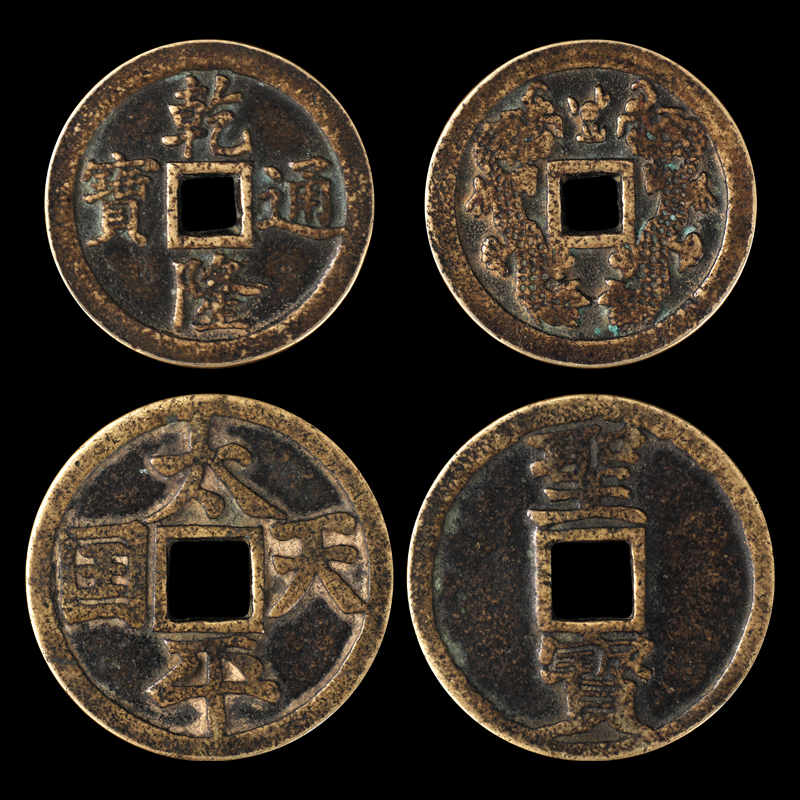 此钱币一组,乾隆通宝花钱文字宋体,黄铜制、色泽偏黄带金光。包浆老道,图文工整端庄,铸工精湛,尽显尊贵气派!太平天国背圣宝,清代铸币!形制规整,笔画硬朗。包浆自然,制作精细非凡!此组钱币具有极高收藏价值与升值空间!