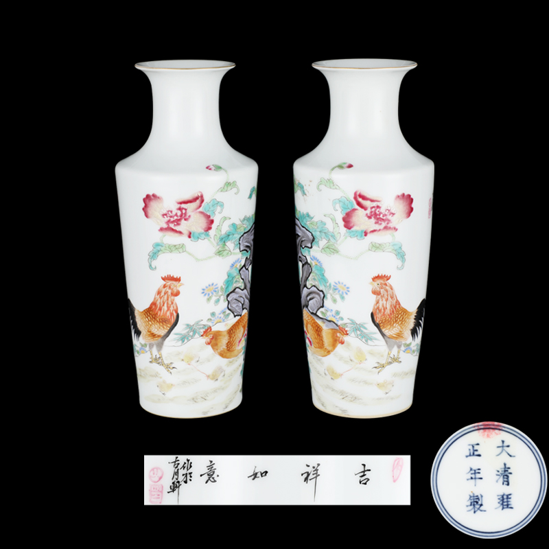 此对瓶器形隽逸端庄,胎质细腻缜密,釉面莹润匀,光泽洁白釉面粉彩绘大鸡(吉)图,色泽纯正清丽画工优良绘画手法一丝不苟,公鸡与母鸡绘画生动,画面祥和,笔触严整而不失流畅精美之致,书题"吉祥如意"寓意吉祥如意,官上加官之寓意,制益精美,整体呈现出雍正时期官窑瓷器高雅的艺术审美水平,具有极高收藏价值。