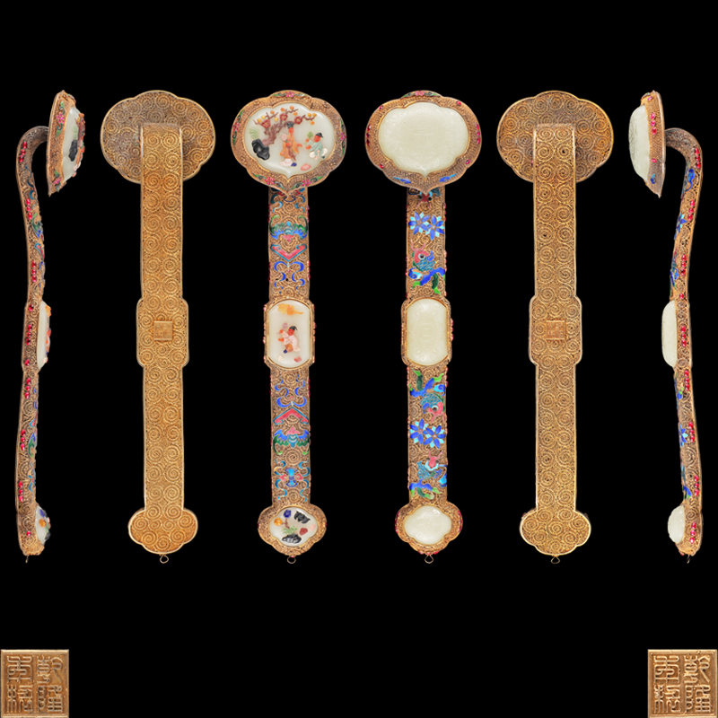 如意为古铜钱纹,通体在丝线纹地上饰点翠,首中尾嵌玉,称为三镶如意,为乾隆时期创造的一种新形制,此品采用累丝工艺是传统金属细工最为精巧的一种技术,利用金,银铜的延展性,抽出细丝,通过盘曲,焊接工艺序组成,制作繁难,玲珑剔透,如意在清朝成为宫廷珍宝之一,它的造型是由云纹,灵芝做成头部衔结长柄而成,为我国传统的吉祥之物