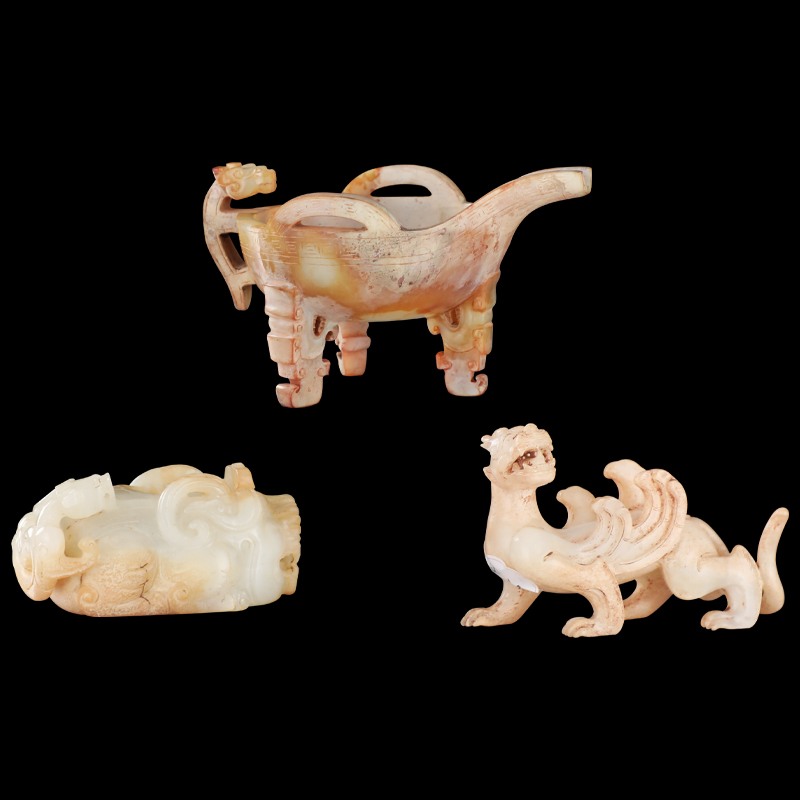 汉羊脂玉螭龙扳指、汉三足龙纹杯、战国白玉螭龙摆件