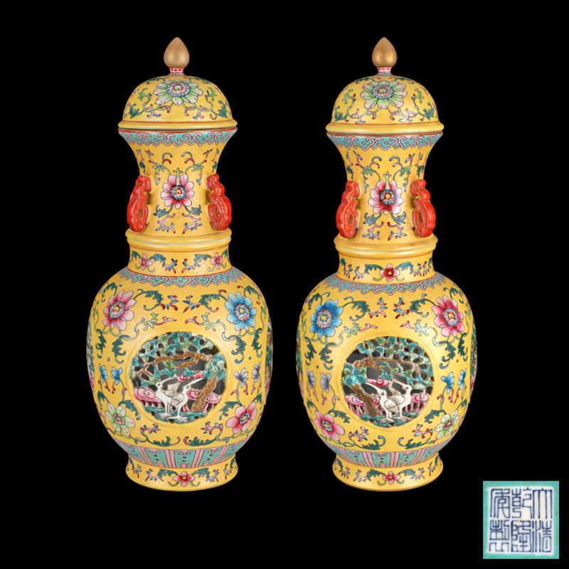 本品形隽秀优美,婷婷玉立,通体以施黄釉为地,色泽娇嫩怡人,开光缕空花鸟,周身装饰以工笔画之效果珐琅彩绘各色菊瓣蕃莲花卉纹,花枝清逸,风姿撩人美不胜收,莹润似玉的釉面映衬更见靓丽非凡,民国人邵蛰民著《增补古今瓷器源流考》记清至乾隆而极盛,器式之多亦莫与伦比。此对器物体现出皇家制瓷工艺的最贵水平,收藏价值极高。