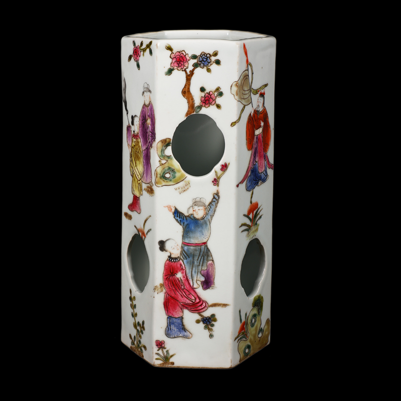 六方粉彩人物镂空帽筒