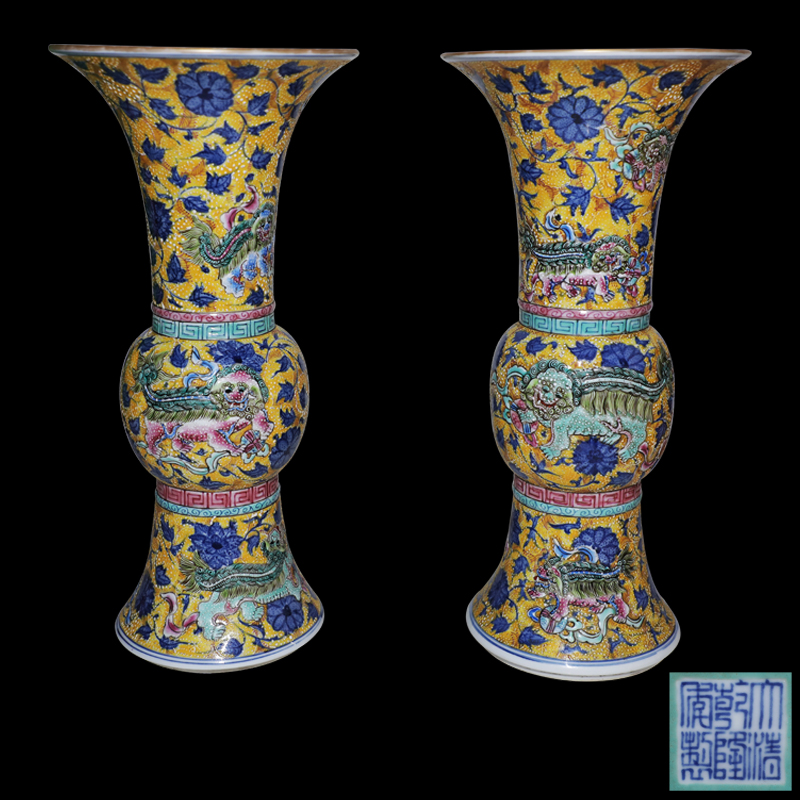黄地珍珠釉青花粉彩狮子纹花觚一对