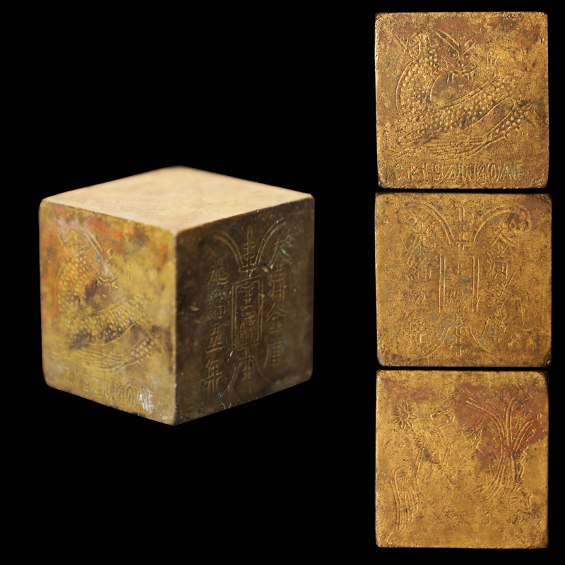 此藏品为正方形形状,形制规整。六面均刻有纹饰。菱形珠圈铸有光绪五年纪年,四面錾刻龙凤纹,刻制精美,色泽纯正。金库因其质地坚细。故名金砖,明清以来受到历代帝王青睐。成为古时专供皇宫供奉和祭祀之用。表面一般会刻有当朝皇帝的图像及制造年代。可谓集观赏性与实用性于一器,等级尊贵稀世珍宝,值得收藏,具有极高的收藏与文化价值。
